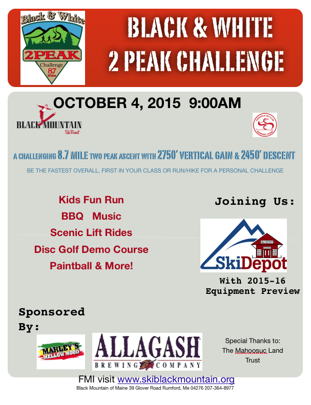 October 4th at 9:00am at Black Mtn Ski Resort. A challenging 8.7 mile two peak ascent with 2750' vertical gain and 2450' descent. CLICK HERE for more info.