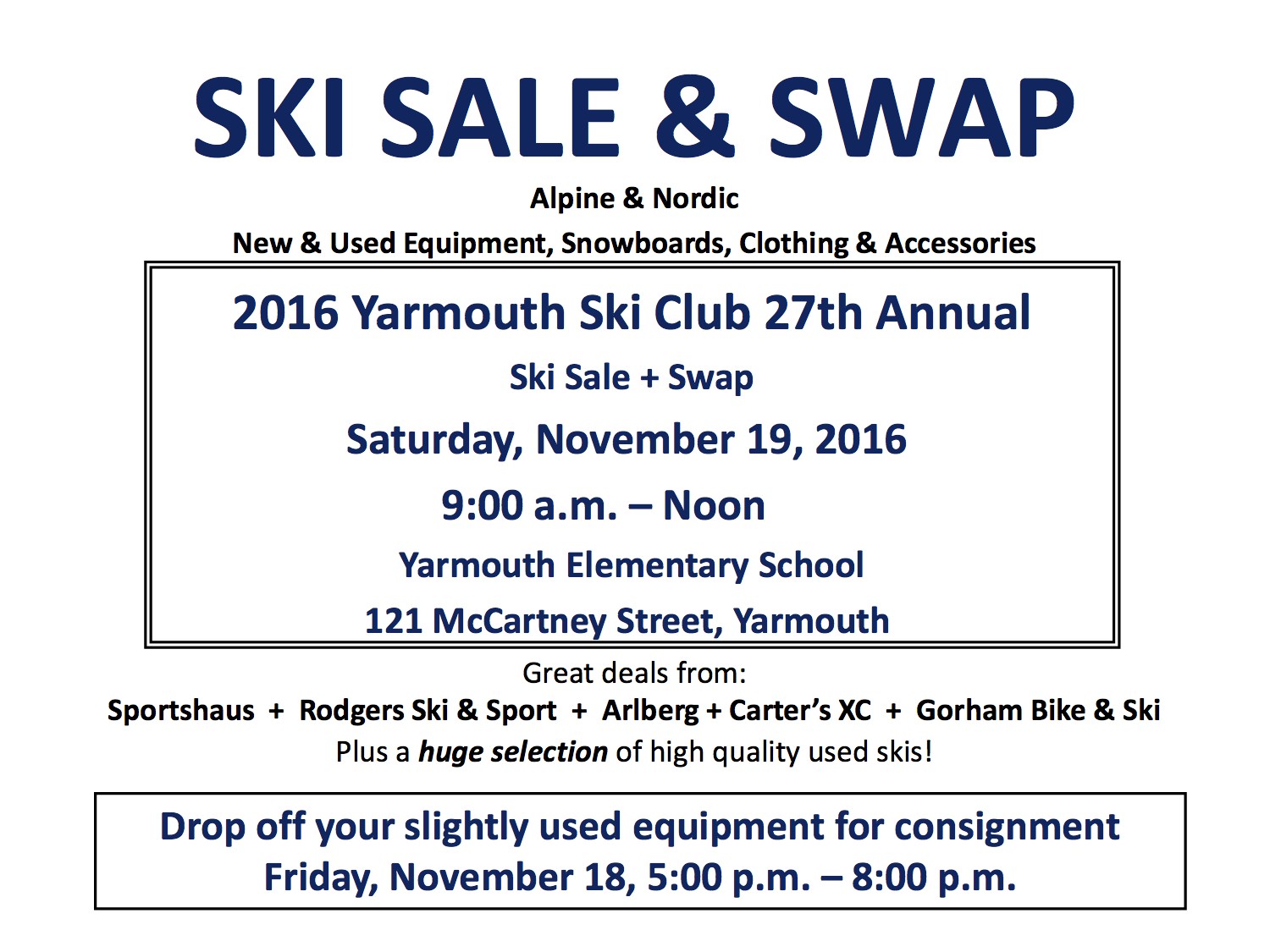 Annual Falmouth ski sale Sunday December 4 from 12 to 3pm in the Falmouth middle school cafeteria, 52 Woodville Road, Falmouth.