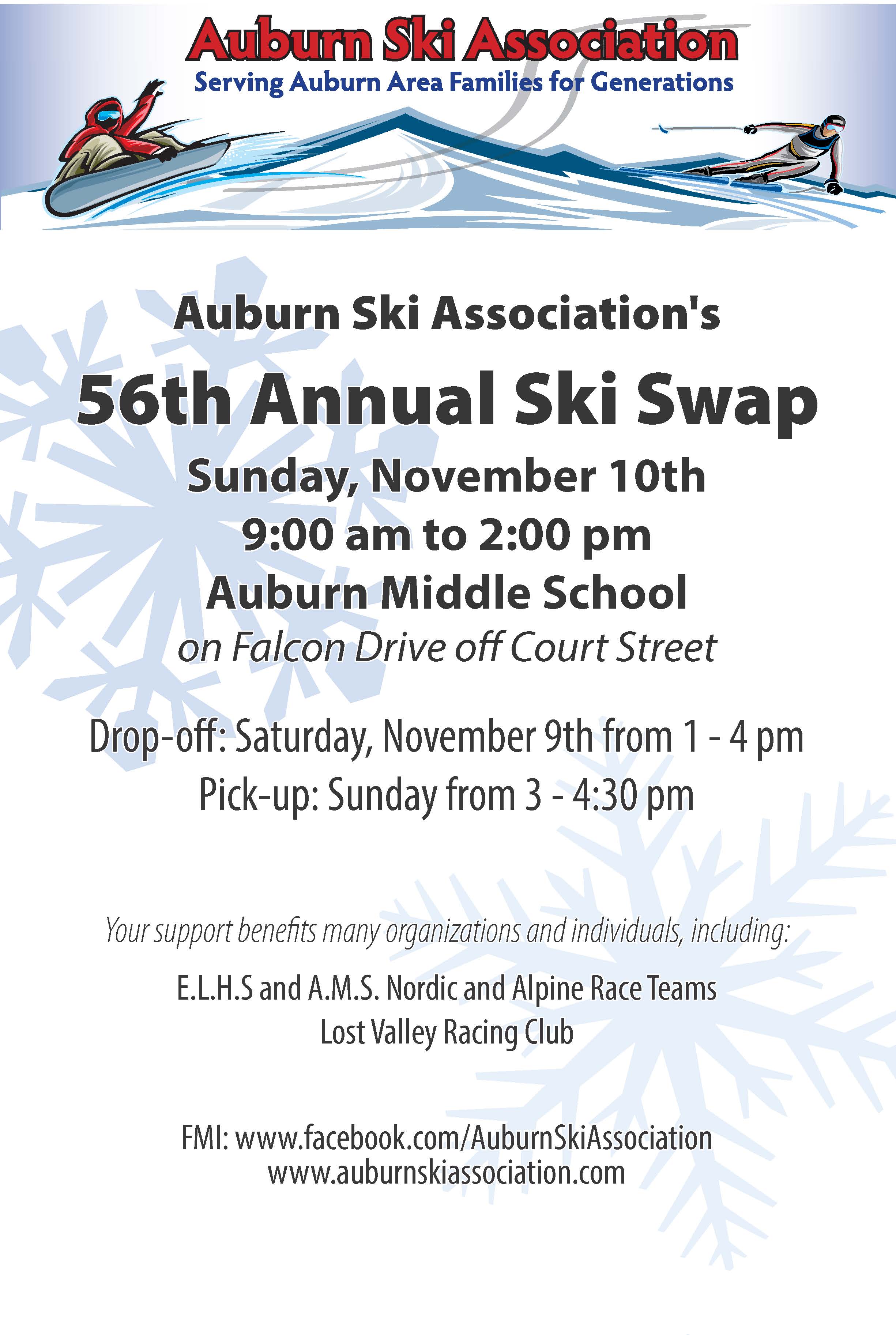 ...Auburn Ski Association's 56th Annual Ski Swap is on Sunday, November 10th, from 9:0am-2:00pm at the Auburn Middle School. CLICK HERE for more