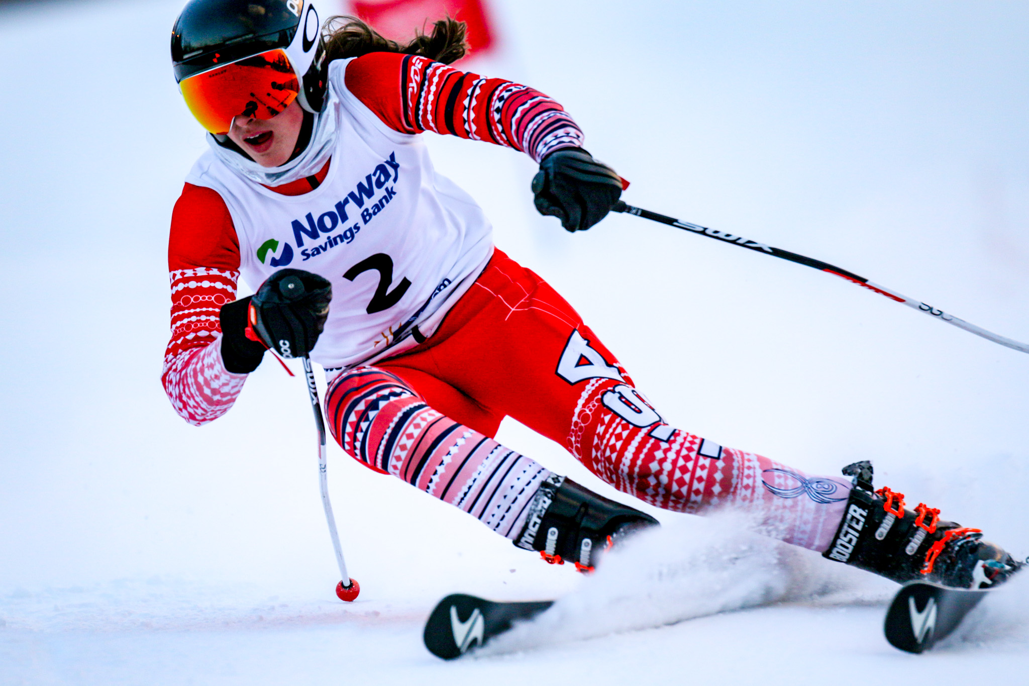 Caroline Burns of Oxford Hills posted the fastest combined time of two runs by more than 8 seconds to win the giant slalom at Mt Abram. Her combined time was 1:58.82. Maranacook teammates Janika