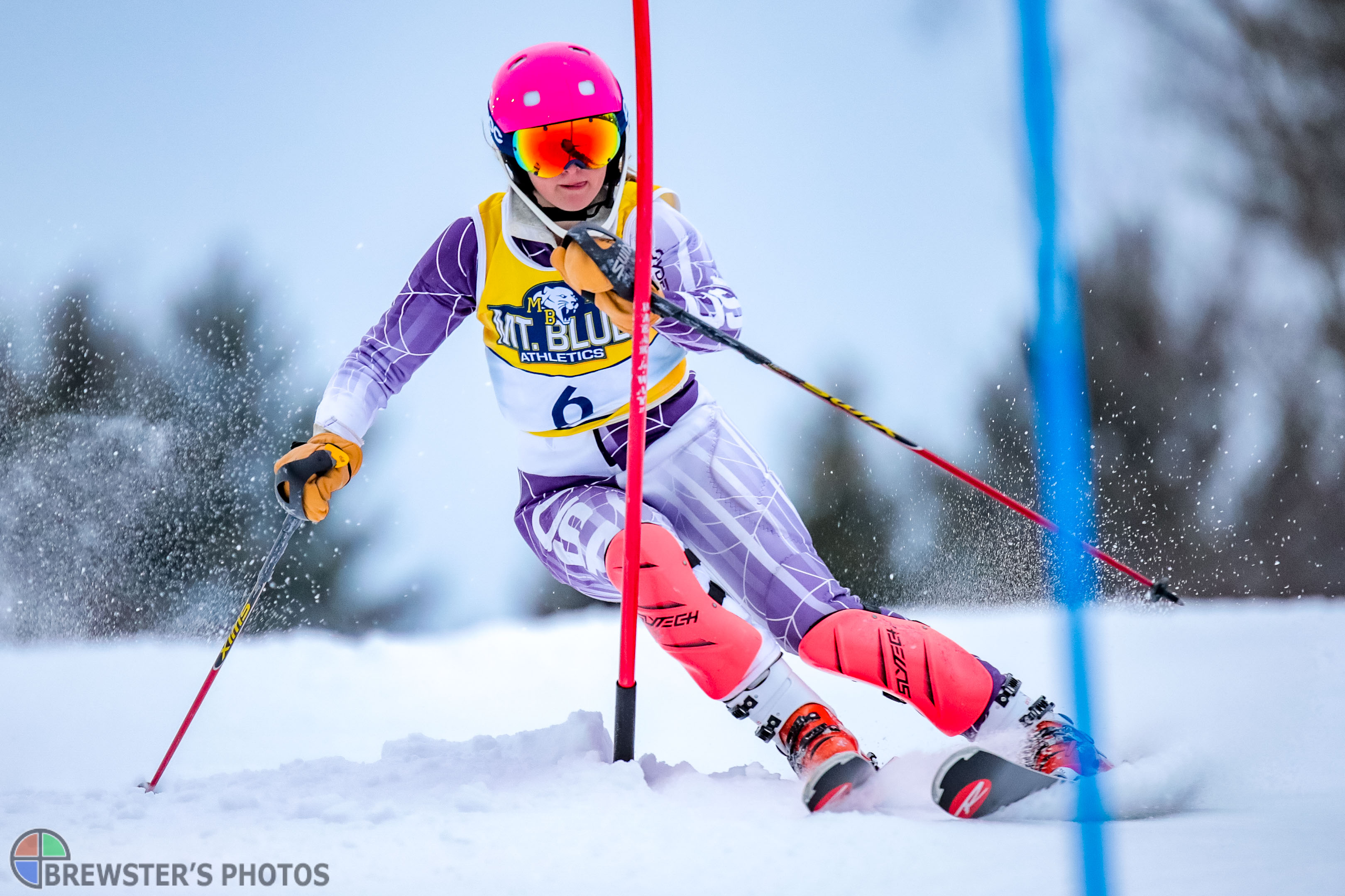 Ellie Pelletier of Mt. Blue and AJ Noyes of Falmouth posted the fastest combined times at the slalom meet at Titcomb Mtn. Jenna Hanrahan of Mt.
