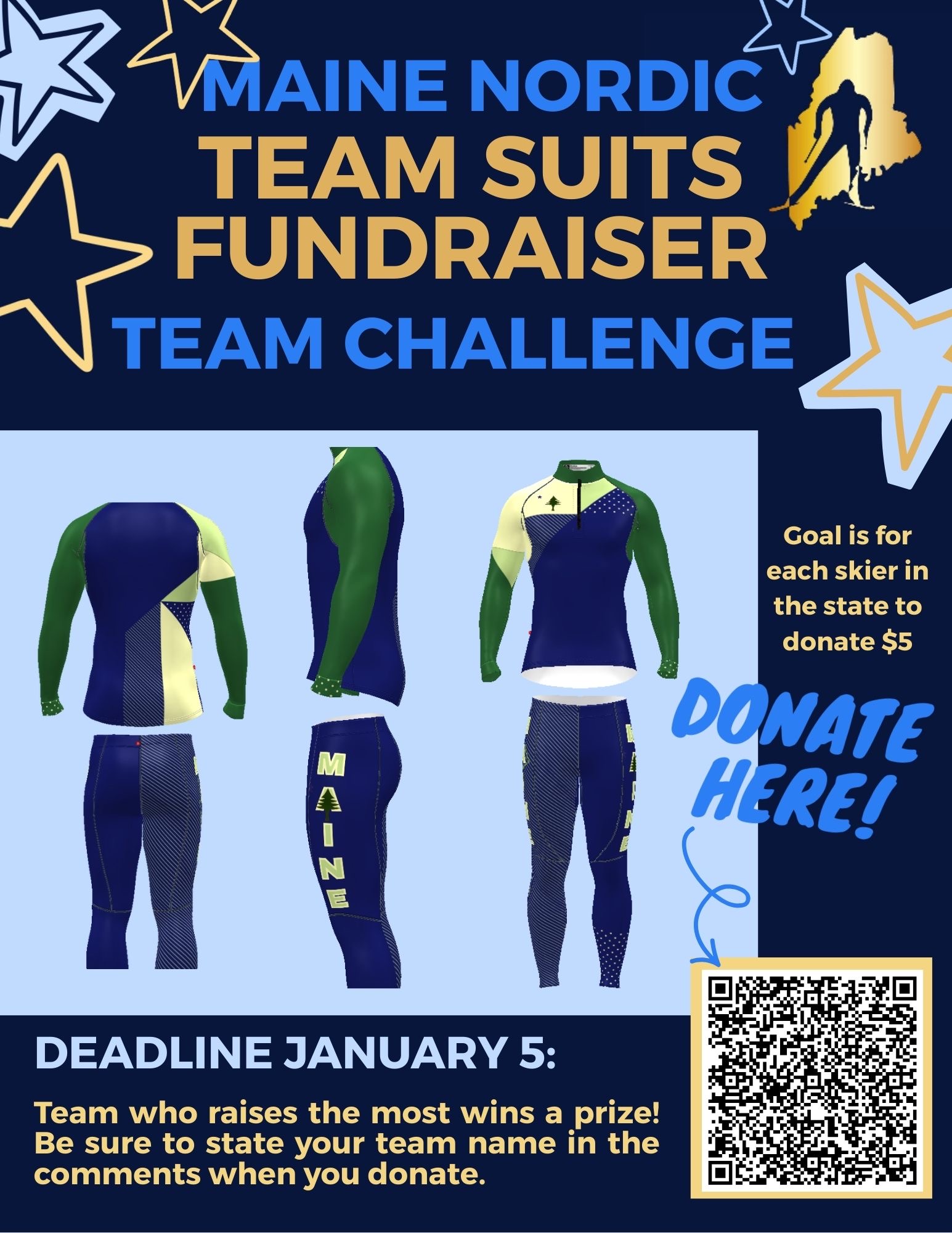 Support the Maine Team with a donation for new race suits!! We are sending out a challenge to all nordic programs in Maine; help us fundraise for new Maine Team Race Uniforms and the winning team will get a gift card to the ski shop of their choosing (value: DOUBLE your fundraising efforts, up to $500)! We are hoping to raise $5/skier, so if your program has 20 kids, aim for $100! Spread the message far and wide and we can reach our goal of $10,000 by our deadline of Jan 10. We want to look sharp when we go head to head against Team Vermont, Team NH, and more! Here is the link to our GoFundME: All donations are tax deductible